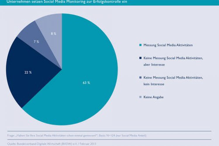 Laut der BVDW-Studie untersuchen sechs von zehn Unternehmen (63 Prozent) den Erfolg ihrer Aktivitäten in sozialen Netzwerken. Obwohl 29 Prozent noch keine derartige Erfolgskontrolle durchführen, bekunden bereits drei Viertel dieser Unternehmen Interesse daran, in der Zukunft Social-Media-Monitoring einzusetzen.