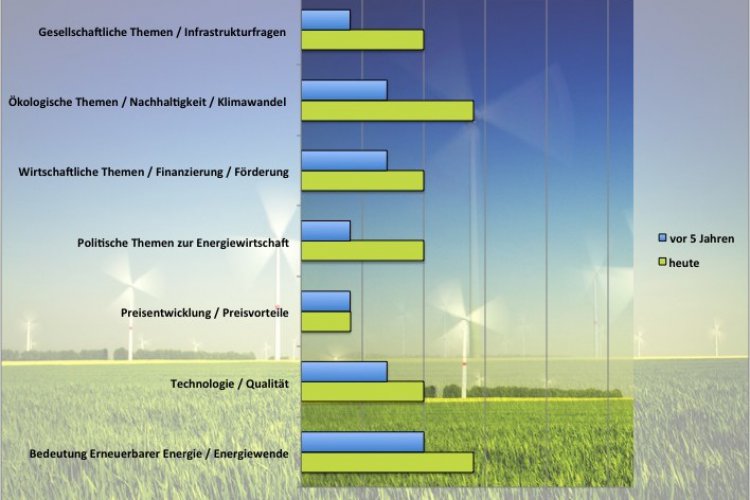 Mit dem Imagewandel und der Informationsforderung der Öffentlichkeit haben sich auch die Themen der Unternehmenskommunikation gewandelt. Ein Schwerpunkt liegt mittlerweile auf gesellschaftlichen und ökologischen Themen wie Nachhaltigkeit und Klimawandel, aber auch auf der Vermittlung von Informationen zur Energiewende. Der Bereich Preisentwicklung ist nach wie vor schwach ausgeprägt, während sich die Bedeutung von Inhalten wie Energieinfrastruktur verdoppelt hat.