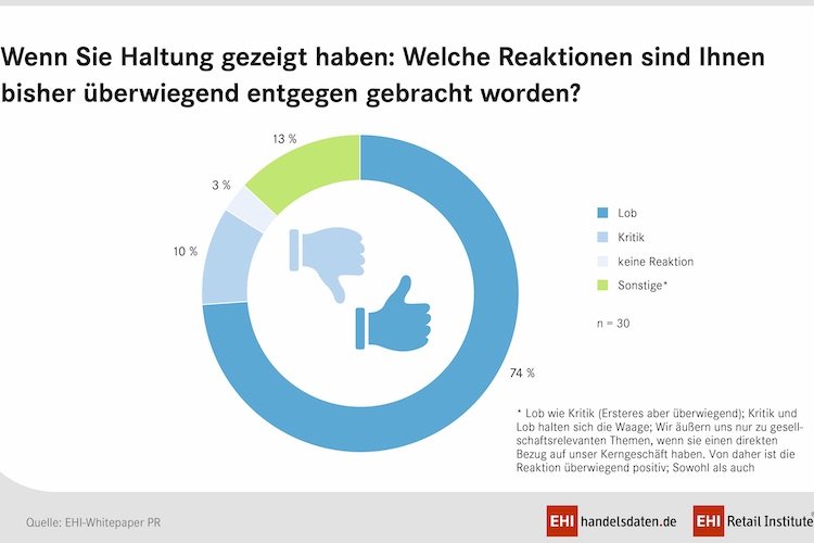 Aus einer Untersuchung des EHI Retail Institute geht hervor, dass sich nahezu der gesamte deutsche Handel in gesellschaftlicher Verantwortung sieht. Das Kölner Forschungs- und Beratungsinstitut hatte dazu im Juni 60 Kommunikationsverantwortliche großer Unternehmen befragt. Ob sie öffentlich auch Haltung zu umstrittenen gesellschaftsrelevanten Themen zeigen, bejahen noch 70 Prozent des Panels.