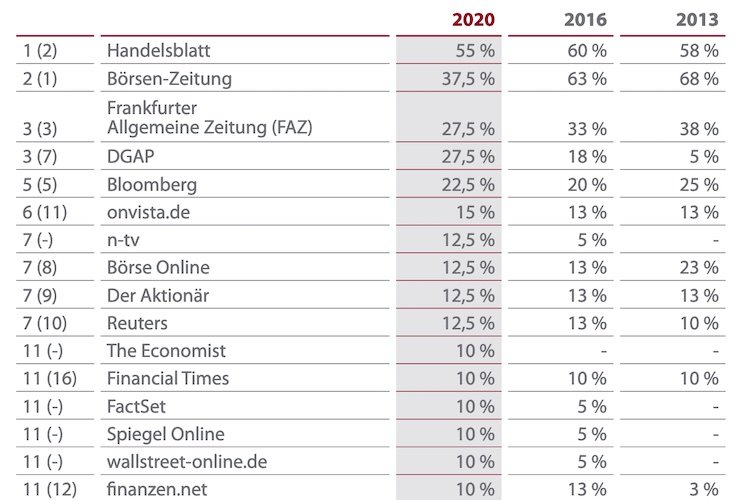 Der "Medienstudie 2020/21" zufolge verlieren Print-Tageszeitungen an Relevanz, Online-Formate haben hingegen gegenüber 2016 an Bedeutung gewonnen. Das "Handelsblatt" mischt auch in der digitalen Welt vorn mit, handelsblatt.com wird von Investment Professionals am häufigsten genutzt. Qualitativ führend ist hingegen der Nebenwertespezialist boersengefluester.de, der zwar eine geringere Awareness im Markt hat, aber bei seinen Nutzern als einziges Onlinemedium eine sehr gute Benotung erreicht. Bei den Online-Finanzportalen schneidet finanznachrichten.de qualitativ am besten ab. Wie schon in der Befragung 2016 wird onvista.de am häufigsten genutzt.