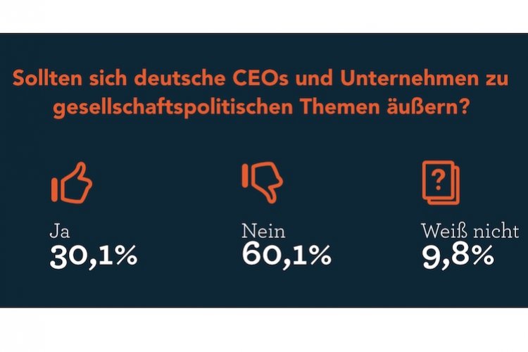 Wie aus dem Report der Kommunikationsberatung unter dem Titel "Eine Frage der Haltung?" hervorgeht, halten es nur 30 Prozent der 2500 zwischen Anfang September und Ende Oktober vergangenen Jahres Befragten für richtig, dass deutsche CEOs und Unternehmen ihre Meinung zu gesellschaftspolitischen Themen bekannt geben. Knapp zehn Prozent sind unentschieden.