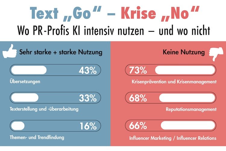 Im Rahmen ihrer alljährlichen Studie haben die dpa-Tochter und die Hamburger Kommunikationsberatung im Februar dieses Jahres 327 PR-Fach- und -Führungskräfte aus Unternehmen, Organisationen und PR-Agenturen in Deutschland und der Schweiz online befragt. Demnach setzen 43 Prozent der Umfrageteilnehmer KI stark oder sehr stark für Übersetzungen ein, ein Drittel lässt sich intensiv bei der Texterstellung und -überarbeitung helfen (33%), bei der Themen- und Trendfindung greifen 16 Prozent der Kommunikatoren verstärkt auf den digitalen Helfer zurück.