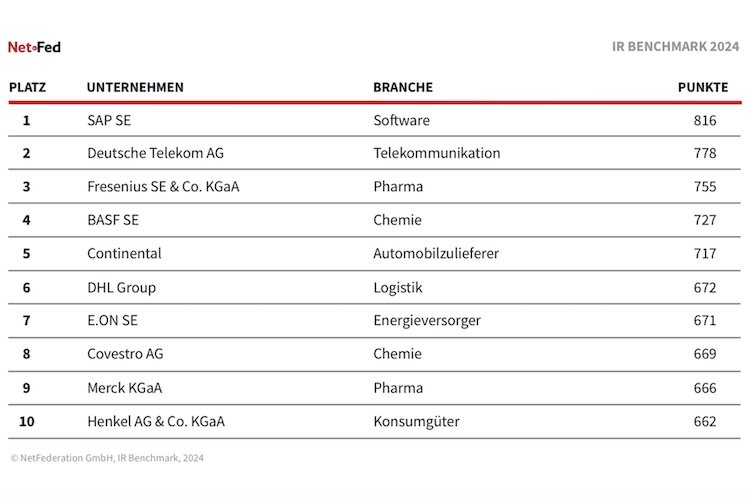 Die IR-Webseiten von SAP hat Net Federation mit insgesamt 816 Punkten bewertet. Damit liegt das Unternehmen deutlich vor dem Vorjahressieger Deutsche Telekom, der es diesmal auf "nur" 778 Punkte brachte. Das Medizintechnik- und Gesundheitsunternehmen Fresenius verteidigte den dritten Platz (755 Punkte). Bemerkenswerte Aufsteiger in der Rangliste sind die DHL Group, die von Platz 34 auf Platz sechs kletterte, und der Eon-Konzern, der es von Platz 25 auf Platz sieben schaffte.