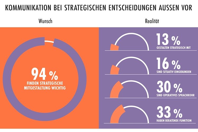 Im Rahmen ihrer alljährlichen Studie haben die dpa-Tochter und die Hamburger Kommunikationsberatung im Februar dieses Jahres 192 Kommunikationsexperten aus Unternehmen und Organisationen in Deutschland und der Schweiz online zur Rolle der Unternehmenskommunikation bei strategischen Entscheidungen befragt. Demnach stufen zwar 62 Prozent der Umfrageteilnehmer die Beteiligung der Unternehmenskommunikation als sehr wichtig und weitere 32 Prozent als eher wichtig ein. Aber nur 13 Prozent der Befragten geben an, dass die Abteilung fester Bestandteil des strategischen Entscheidungsteams ist und somit tatsächlich strategisch mitgestaltet.