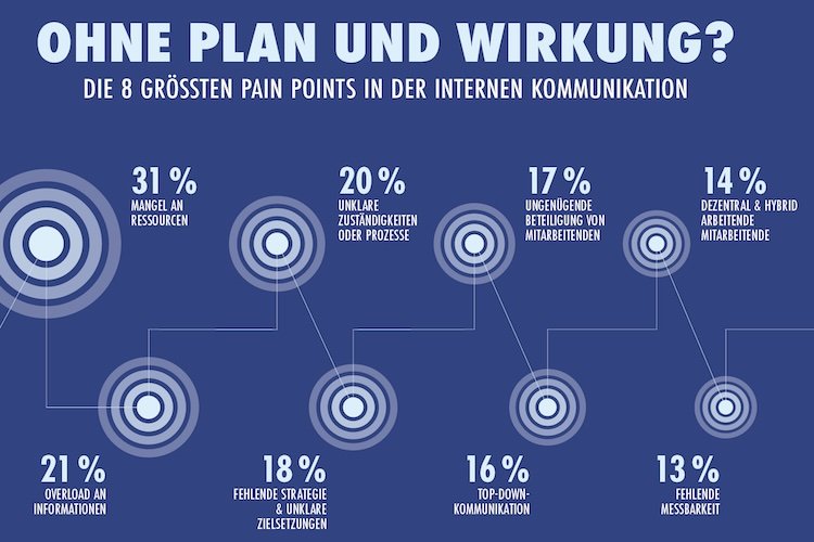 Platz zwei der größten Herausforderungen belegt der Umfrage zufolge die Informationsflut: Gut jeder fünfte Kommunikationsprofi sieht ein Zuviel an Kommunikationsmaßnahmen oder Kanälen als Hindernis. Fast ebenso viele Befragte beklagen unklare Zuständigkeiten oder Prozesse. Für 18 Prozent sind eine fehlende Strategie und unklare Zielsetzungen das größte Problem.