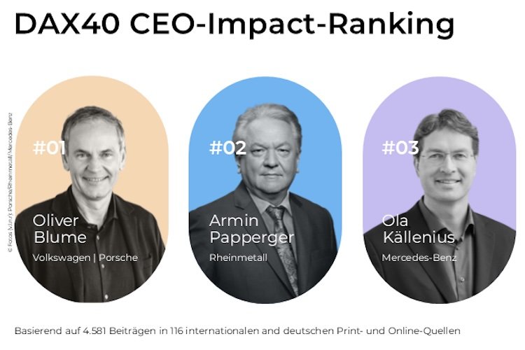 Die weiteren Top-10-Plätze im CEO-Impact-Ranking belegen BMW-CEO Oliver Zipse, Roland Busch (Siemens), Christian Sewing (Deutsche Bank), Bill Anderson (Bayer), Christian Klein (SAP), Bjørn Gulden (Adidas) und Oliver Bäte (Allianz).