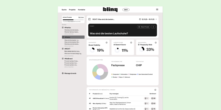 Das Start-up aus Köln hat seine Software um ein Analyse-Tool erweitert, das systematisch sichtbar mache, welche Quellen Large Language Models (LLMs) heranziehen. Das GEO-Modul sei eine Reaktion darauf, dass nicht mehr nur Suchmaschinen und Website-Traffic über die Wahrnehmung von Marken und Unternehmen entscheiden, sondern die Antworten von Chat GPT, Google AI Overviews oder Perplexity. Laut Blinq zeige das Tool, in welchen Medien und Quellen Marken von LLMs zitiert werden und wie sie im Vergleich zum Wettbewerb abschneiden.
